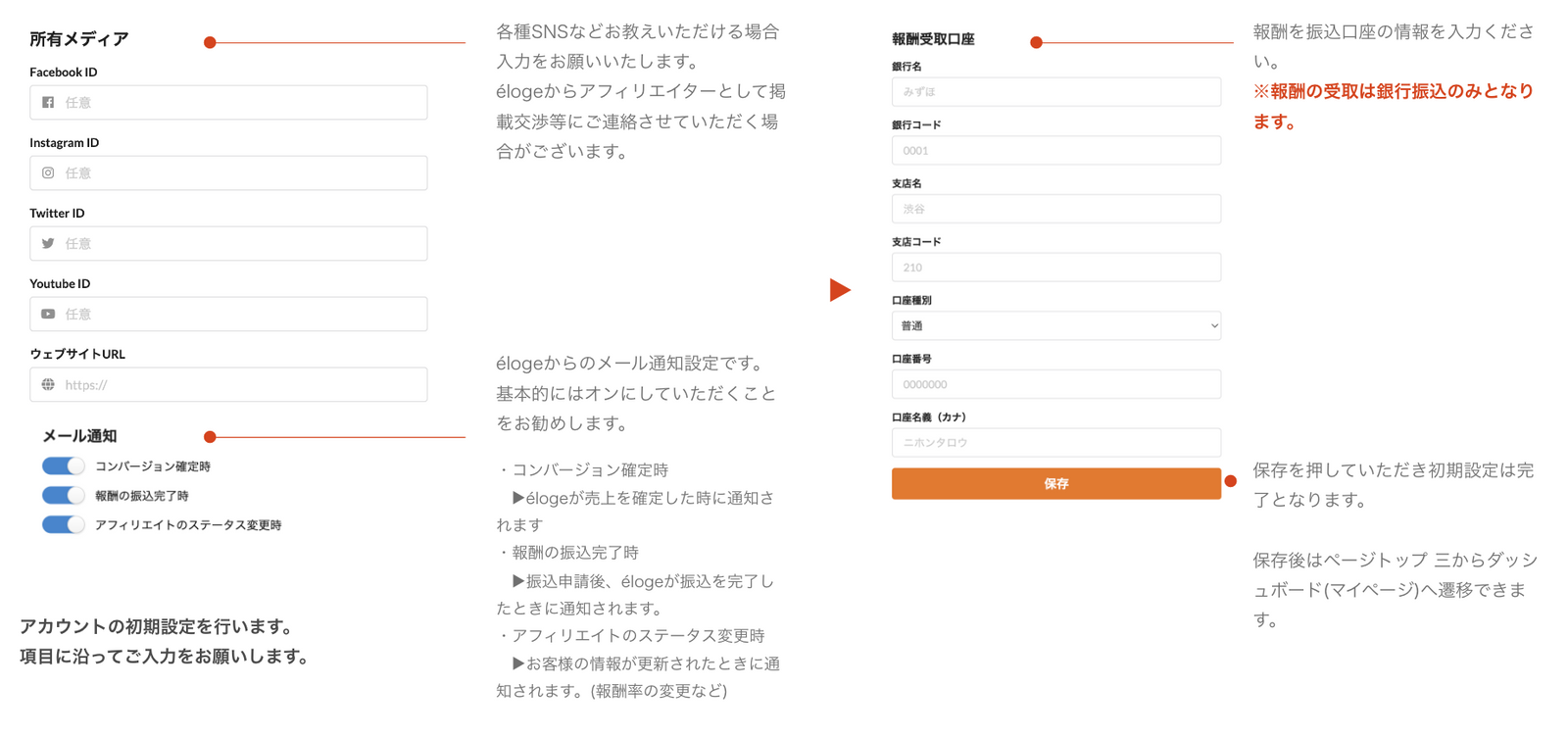 アカウントの初期設定を行います。 項目に沿ってご入力をお願いします。
